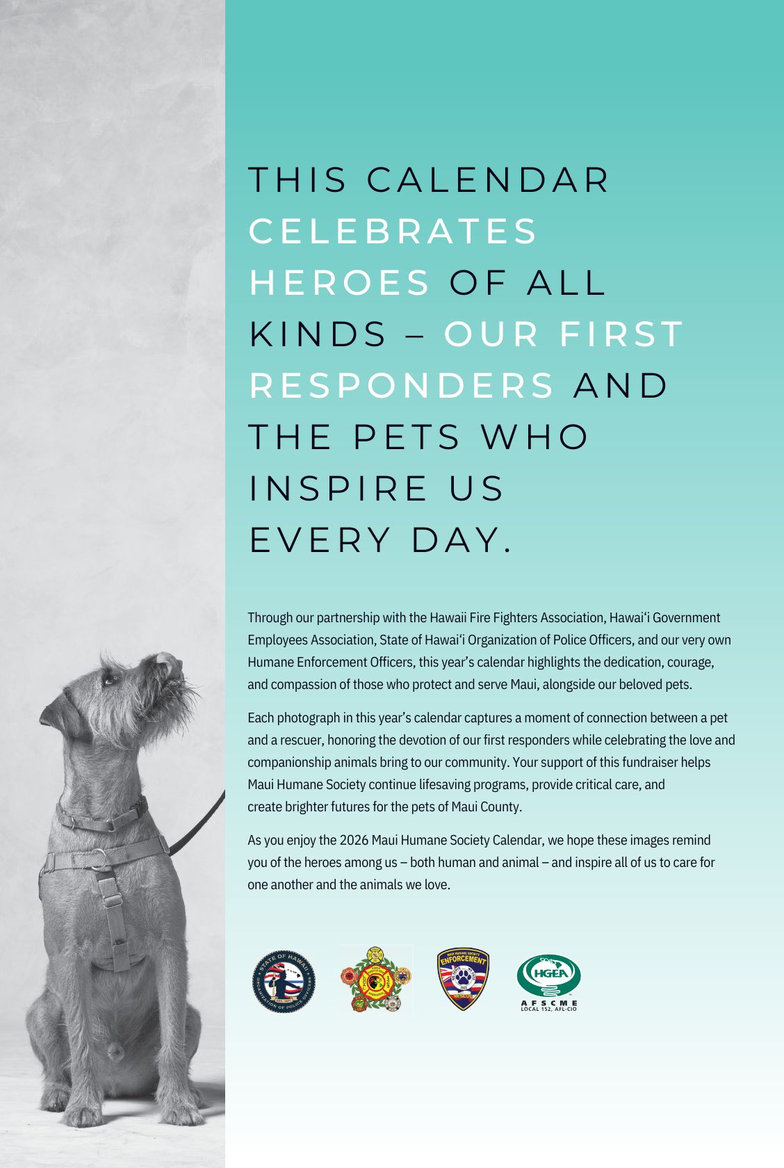 Through partnerships with the Hawaii Fire Fighters Association, Hawai'i Government Employees Association, State of Hawai'i Organization of Police Officers, and Maui Humane Society's own Humane Enforcement Officers, this year's calendar highlights the dedication, courage, and compassion of those who protect and serve Maui, alongside our beloved pets.